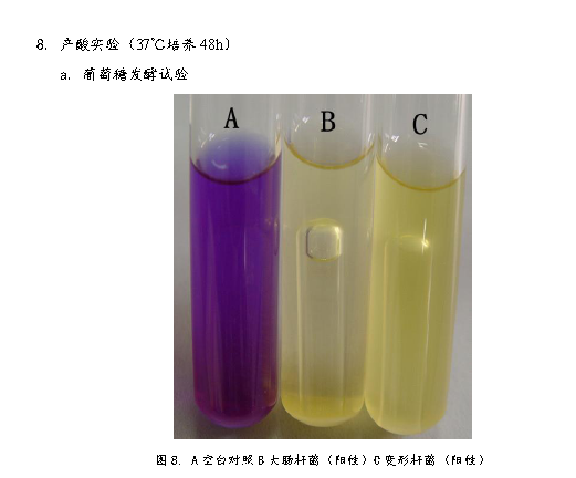 3、 將產氣腸桿菌接種到生理生化檢測培養基中,37℃培養48h。檢測菌種生理生化特性。